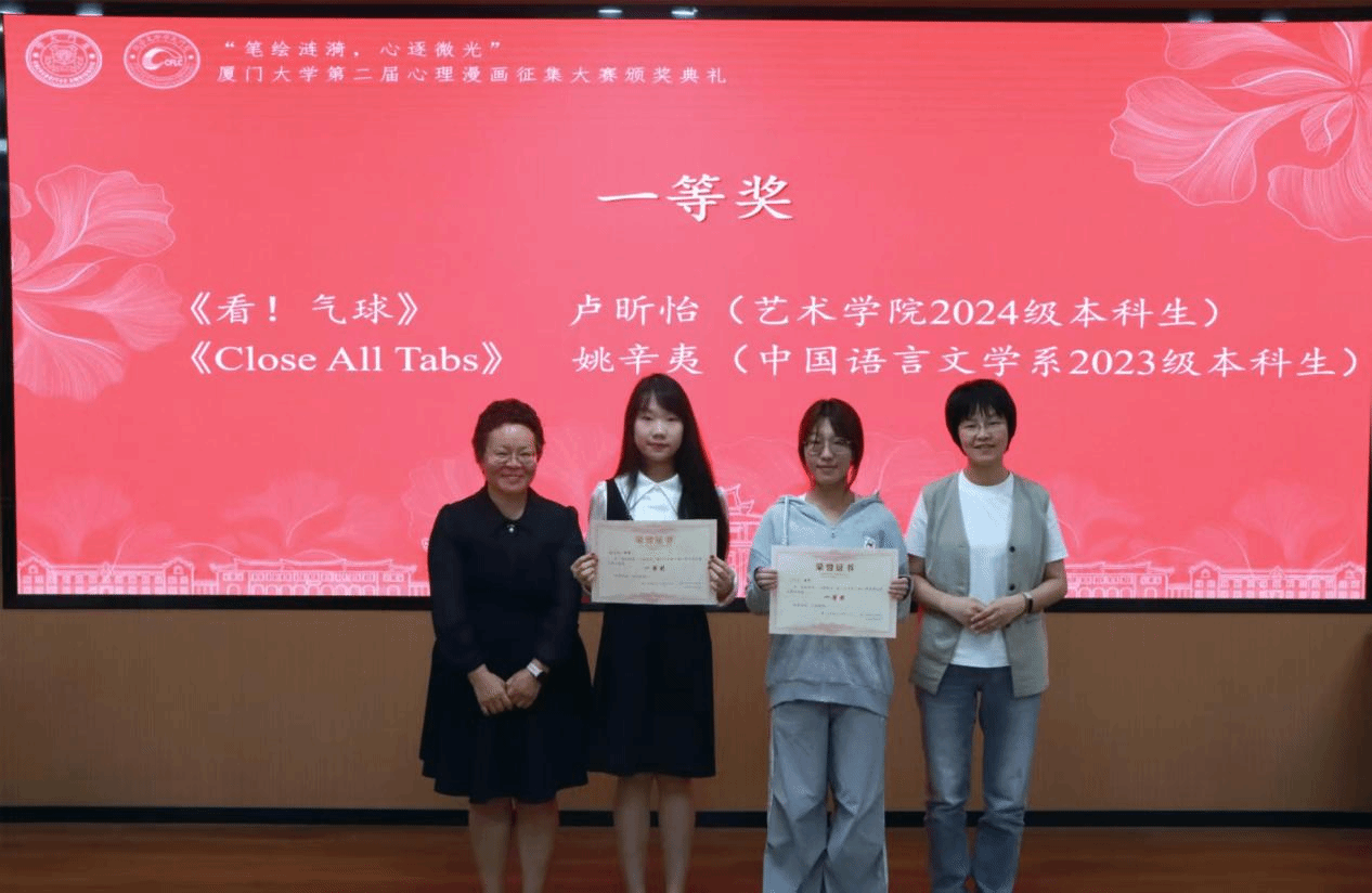 为深化心理健康教育,创新开展“自新、自爱、自律、自强”知行教育,厦门大学外文学院、厦门大学心理咨询与教育中心联合举办“笔绘涟漪·心逐微光”第二届心理漫画征集大赛。经过线上投票和评委评审,大赛获奖名单揭晓,并于5月28日在南光三112报告厅举行颁奖典礼。外文学院党委副书记罗俊峰,心理咨询与教育中心主任赖丹凤、副主任黄福生等多位老师出席活动。