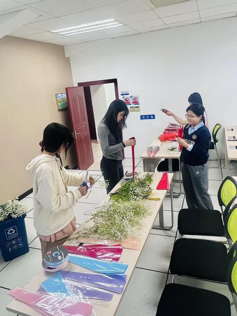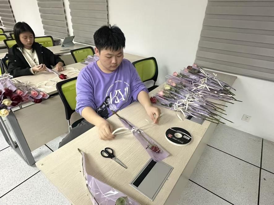 花材运回后,醒花与包装工作随即展开。在学生干部的统筹带领下,志愿者们齐聚一堂,分工合作,有条不紊地投入到花材的筹备与包装工作中。大家围坐于长桌旁,细心且耐心地为每一枝花朵进行醒花、去叶、剪刺与包装。整个过程中,同学们相互协作、细致认真,既保证了花材状态良好,也让每一束花都呈现出整洁美观的效果。渐渐地,一束束饱含心意与祝福的鲜花在桌面上整齐铺展,整个活动室氤氲着醉人的芬芳。