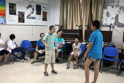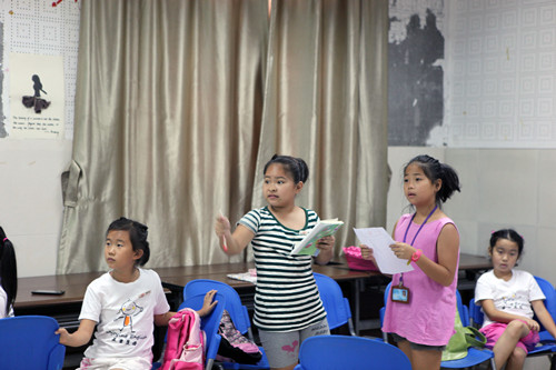 7月8日上午,厦门大学外文学院“英言厦语”实践队开展了一系列英语沙龙活动,旨在让小朋友们在轻松愉悦的氛围中积累英语知识,同时也促进团队协作,增强灵活应变的能力。 活动共分三个环节。第一个部分是一个经典的猜词游戏――“吊死鬼”(hangman)。游戏规则是老师先提示字母数量然后让小朋友们猜,猜对就把该字母写在相应位置上,猜错就开始画小人上吊图,在画完前猜出单词全部就算赢。反之,画完上吊图就输了。 复习过之前教过的单词之后,游戏便开始了。有的班是以个人为单位比拼,有的班是分成了不同的小组进行车轮战。看似简单的游戏,却让每个小朋友的心像垂挂的小人一样高高悬起,紧张不已。老师一给出字母个数时,小朋友们便开始绞尽脑汁冥思苦想。要是答对了他们就兴奋不已,高呼万岁;若是没答对就愁眉苦脸,特别是看到绞刑架上的小人一笔一笔被画完时,全班小朋友都来帮忙猜词,努力不输掉游戏。每个班的小朋友们都团结协作,合力猜出了比如resolution、supermarket等长难单词,令授课的老师们惊喜不已。 第二个游戏主要是为了考验小朋友们的反应能力。首先老师准备了人体各个部位器官的英文单词让小朋友们熟悉,接着请出小朋友上台,当老师说出某一身体部位时,小朋友便要立刻作出反应指出自己身上的相应部位。在这个游戏中,常常有小朋友忘记,当听到“eyes”等复数名词时两边都要指到。而这个游戏正是加深了他们对复数单词的概念。除了这个游戏之外,还有一个大家都很熟悉的游戏――“萝卜蹲”,不过今天玩的是它的英文版。用各种不同颜色来作为小朋友的代称,而他们则要一边做蹲下的动作,一边用英文指定下一个下蹲的颜色,反应不过来的人就被淘汰。这个游戏的过程同样是爆笑连连,有的小朋友忘记自己是什么颜色;有的小朋友说错了先后顺序,“坑”了自己一把;有时赛况往往在两个人之间僵持不下:只见“white”蹲完“blue”蹲,“blue”蹲完“white”蹲……引得观众们笑声不断,嗨翻全场。 最后的环节是“你画我猜”。两个人为一组,一个人看着老师给出的词组,用自己的肢体语言将其表演出来,而另外一个成员则要猜出这是什么词组。这个游戏同样十分刺激,特别是看别的小朋友在上面陷入瓶颈的时候,底下的小朋友恨不得冲上去替他比划。好在小朋友们都能够密切协作,配合默契,大部分的词组对他们来说都是小菜一碟。有的小朋友的表演属于“抽象派”,没人能猜出他想表达什么;有的又是滑稽大师,动作令人忍俊不禁。所有人都尽情地享受着游戏,大家都乐在其中。 一上午的英语沙龙活动让我们看到了小朋友的活泼、机智、可爱、团结……寓教于乐,启智于行。在传递知识的同时传递快乐,这也是”英言厦语”夏令营的宗旨:Fun with English。愿每个小朋友们都能在这里度过一个快乐难忘的暑假!