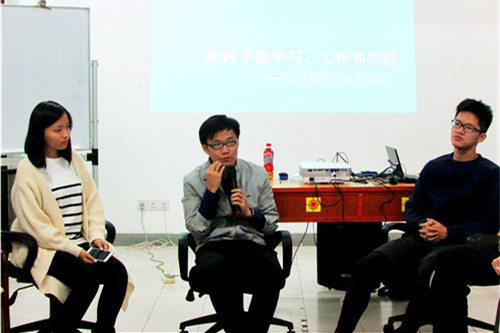 11月27日19时30分,外文学院“牛仔很忙”心理沙龙在南光四100顺利开展。厦门大学心理咨询与教育中心专职教师黄福生担任本次沙龙的主讲人,以“如何平衡学习、工作和生活”为主题,为同学们答疑解难。20名外文学院2015级同学参与了本次活动。通过黄老师的悉心讲解与互动游戏环节,同学们对如何在大学生涯中进行学习、工作和生活的协调有了进一步的认识与了解。 沙龙在轻松舒缓的音乐中开始,老师与同学们围圈就座。首先,同学们就“如何平衡学习、工作和生活”的问题提出了学业压力大、闲暇时间少、缺乏自制力、各项活动难以平衡等困扰。黄老师对同学们的困扰表示理解,并以互动游戏的方式循循善诱,请同学们在接下来的“交替涂鸦说故事”环节中进行感悟并寻找答案。 “交替涂鸦说故事”是两人一组、交替作画的互动游戏。在本环节中,同学们的画作风格或文艺清新,或搞怪嘻哈;题材涉及风景画、人物画、Q版画等各种类型,图画中柯南、海贼王、哈利・波特、少年派、小王子纷纷亮相……同学们放下了日常生活中的紧张和压力,在绘画过程中释放自己的激情和活力,创意百出、天马行空,参与热情格外高涨。作画结束之后,老师请同学们相互交流自己的绘画过程,两个小组的同学积极分享了小组创作中的趣事,并以其新颖的创意、活泼的画风赢得了大家的阵阵掌声。 “交替涂鸦说故事”环节结束之后,黄老师引导同学们对本环节的收获进行讨论与分享。同学们表示在交替涂鸦的过程中感受到了压力的释放和心情的放松,体会到小组合作与交流的乐趣,收益颇丰。 最后,此次沙龙在黄老师的总结中结束。他指出:“时间太少,事情是做不完的,更无法事事完美。最重要的是知道自己想要什么,精神幸福才是真正的幸福。”黄老师的一番话深入浅出,使同学们认识到在忙碌的大学生活中要学会树立自己的目标,快乐地学习、工作与生活,才能促进自身的全面健康发展。 本次沙龙根据我院各班心理委员上交的月度心理报表反馈内容,针对大家在大学生活中遇到的问题,以新颖有趣的形式,使同学们在合作画图中体验到生活的多彩,了解到了自我调节的重要性,并引导同学们以积极乐观的心态对待学习、工作和生活,对当代大学生的健康成长具有积极的现实意义。  同学们交流困惑