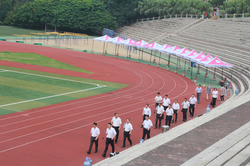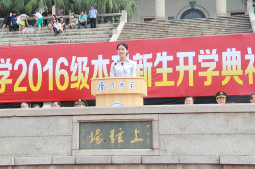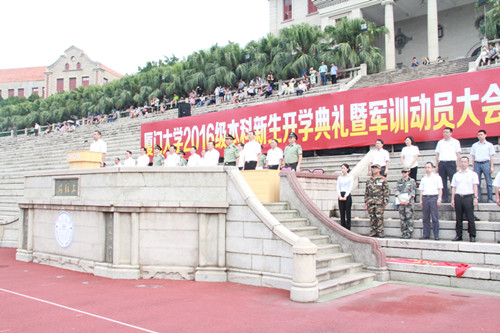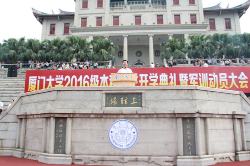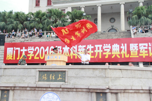 又是一年军训时,且看上弦满英姿。厦门大学2016年军训正在缓缓拉开帷幕。烈日骄阳融不化一颗颗赤子之心,狂风暴雨打败不了真正的勇士。先苦后甜、磨练当先,正是新同学们应学习的大学第一课。 8月26日下午3时30分,外文学院2016级本科新同学们在外文学院院楼南光三前的凤凰台集合完毕。在我院党委副书记杨云良老师和团委副书记、2016级本科生辅导员肖盈老师的带领下,同学们精神抖擞地走向上弦场,参加厦门大学2016级本科新生开学典礼彩排仪式及军训分兵仪式。同学们抵达上弦场后在教官的指挥下对第二天的活动议程进行初步演练。 8月27日上午8时,厦门大学2016级本科新生开学典礼暨军训动员大会在上弦场隆重举行,我院张龙海院长出席本次新生开学典礼。外文学院新生分布在四营十连一、二、三、四排和十一连四排,由杨云良副书记和肖盈老师带队入场。同学们列队整齐、斗志昂扬、高唱国歌,冉冉升起的五星红旗为大会增添了一丝庄严。 朱崇实校长在典礼上首先发表讲话。他对进入厦门大学学习的全体同学表示欢迎,尤其强调向远在马来西亚分校的同学们表示热烈的祝贺。朱校长向同学们提出几点期待,希望同学们能够“以感恩的心努力学习”、“以好奇的心探索学习”、“以快乐的心愉快学习”、“以谦虚的心认真学习”和“以宁静的心安心学习”,祝愿同学们能够在厦大度过人生中最精彩、最幸福、最美好的一段时光。朱校长同时指出,希望同学们在接下来的军训中能坚忍不拔、团结互助,弘扬长征精神,上好大学第一课。随后,教师代表和老生代表先后向同学们分享了自己在厦大工作、学习及生活的快乐经历与宝贵经验,紧接着,新生代表也在开学典礼上表达了自己对接下来在厦大学习和生活的美好憧憬与期待。2016级本科新生开学典礼在庄严的校歌声中圆满结束。 厦门大学2016年军训动员大会随之正式开始。校党委副书记、学生军训工作领导小组组长林东伟作军训动员报告并为军训团授旗。随着“厦门大学学生军训团”的大旗飘扬在上弦场上空,《中国人民解放军进行曲》奏响,厦门大学2016年学生军训正式拉开帷幕。 士不可以不弘毅,任重而道远。希望2016级外文学子能在军训中克服各种困难,磨炼意志、砥砺自我,充分展现当代大学生的朝气与活力!  同学们整装待发