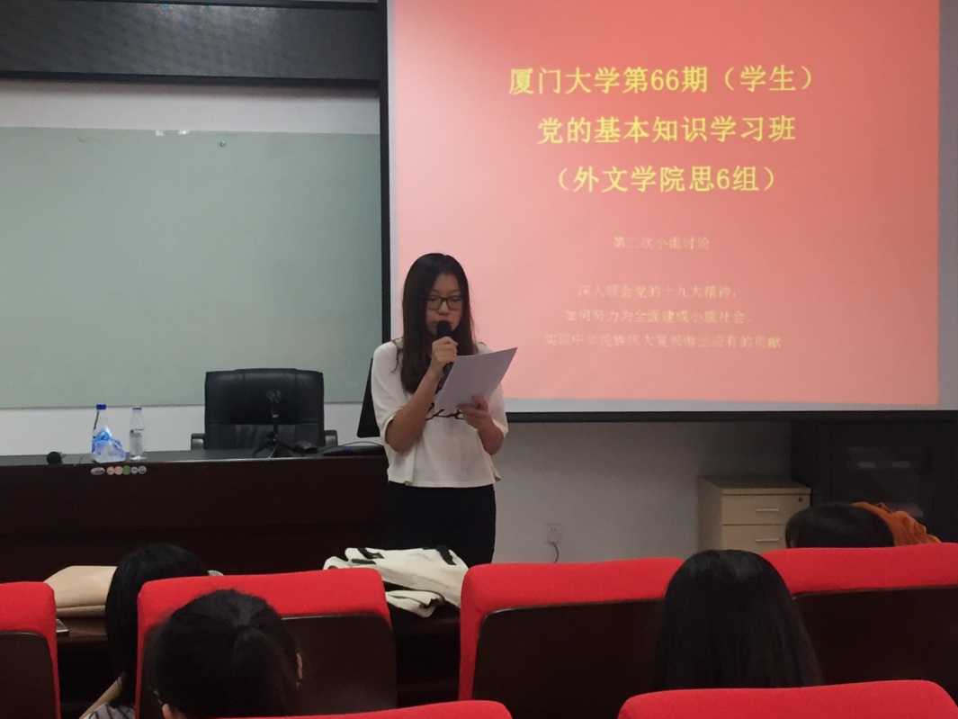 厦门大学外文学院第66期(学生)党的基本知识学习班外文学院思6组第二次小组讨论于10月28日下午五点半在外文学院教学楼南光三313举行。此次小组讨论的主题为“深入领会党的十九大精神,如何努力为全面建成小康社会、实现中华民族伟大复兴做出应有的贡献”。带队老师周晓牧老师参加了此次小组讨论,20名党校学员悉数参加,先后发表了自己的心得体会。