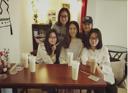 两位聋人姐姐(右一和右二)和同学们在咖啡店合影