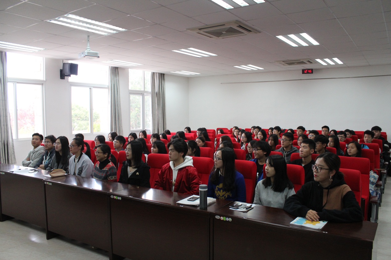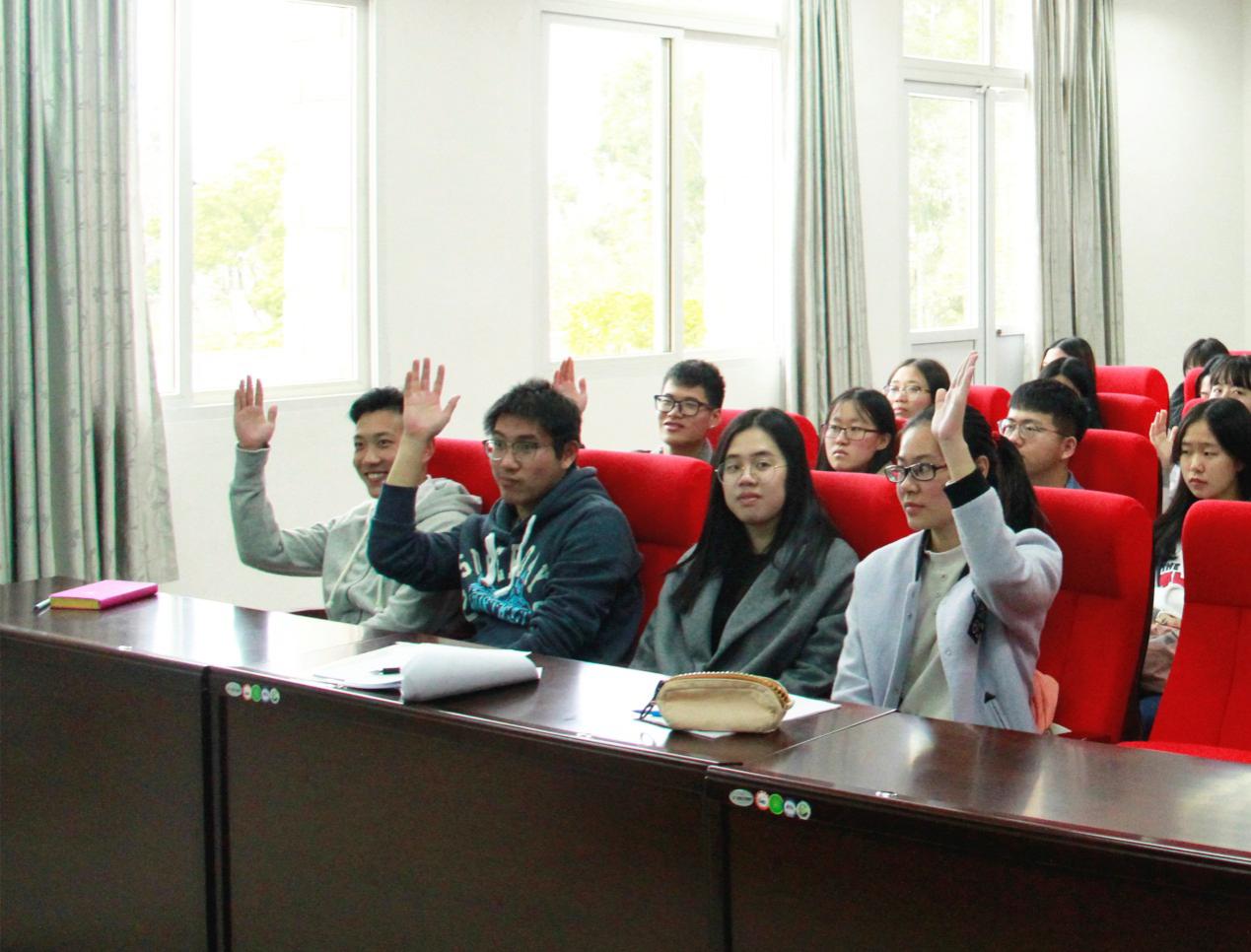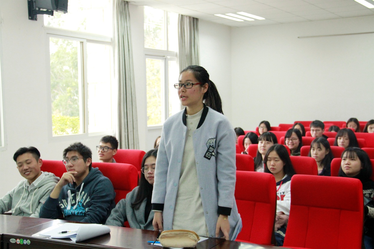 杨盛澜老师首先解读了“大会主题”、“极不平凡的五年”、“新时代”、“新时代的主要矛盾”、“新时代的历史使命”这五个关键词。她从党的十九大主题及其意义两方面介绍了十九大的背景;用十大方面的历史性成就解读了“极不平凡的五年”;介绍了习近平总书记赋予这个“新时代”的五个定位;阐述了“新时代的主要矛盾”和“新时代的历史使命”。最后,她引用了习近平总书记的一番话作为总结——“今天,我们比历史上任何时期都更接近、更有信心和能力实现中华民族伟大复兴的目标”,以此鼓舞同学们的斗志,号召大家为实现中国梦而奋斗。杨盛澜老师充分而独到的解读,使大家对十九大精神有了更深刻的理解,同时也激起了现场听众的自豪感和责任感。在解读这五个关键词的同时,杨盛澜老师还通过提问的方式积极与在场师生互动。现场听众积极活跃,踊跃发言。