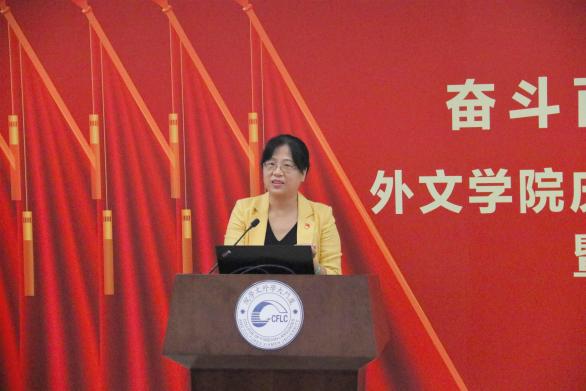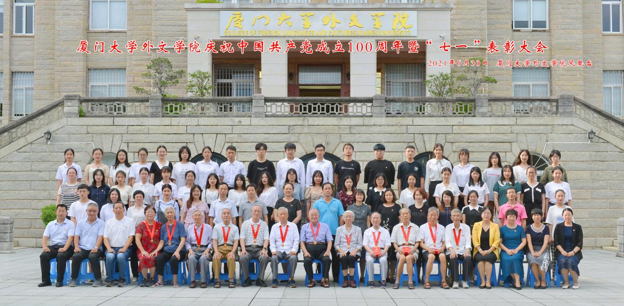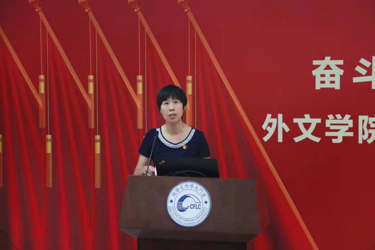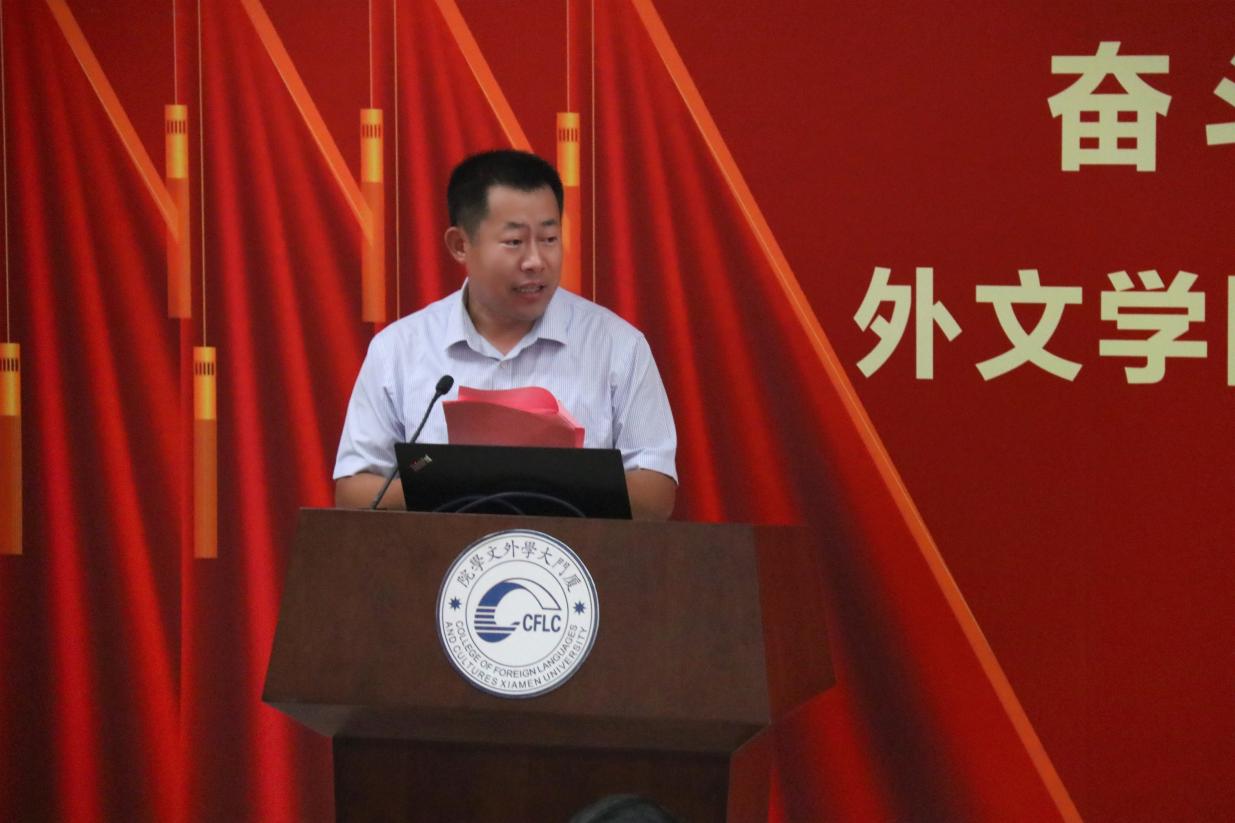 6月30日下午,外文学院在德贞楼112报告厅举行庆祝中国共产党成立100周年暨“七一”表彰大会,表彰先进、弘扬正气、鼓舞斗志,进一步动员和激励各支部、共产党员和党务工作者为学校“双一流”建设作出新的更大贡献,以优异成绩献礼党的百年华诞。校党委党建办主任兼组织部副部长廖志丹,校基层党建联络员黄定基,学院党委书记陈志伟,党委副书记马龙、沈丽秀,党委委员、副院长徐琪、辛志英,党委委员顾鸿飞出席本次会议。会议由学院党委副书记马龙主持。