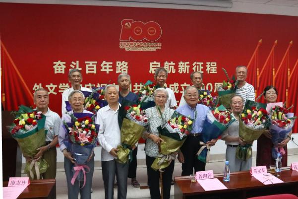 今年,党中央决定首次向符合条件的老党员同志颁发“光荣在党50年”纪念章,外文学院共有17名老党员获颁纪念章,他们当中党龄最长的为67年。在庄严的中华人民共和国国歌和深情的诗朗诵《我爱你,中国共产党》结束后,廖志丹主任、黄定基老师、陈志伟书记共同为到场的11位老党员一一颁发“光荣在党50年”纪念章。全场掌声雷动,在场师生们深受教育,备受鼓舞。