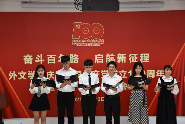 在接下来的环节中,学院党委书记陈志伟向受到表彰的先进集体和优秀个人表示热烈的祝贺,向长期奋战在学院改革发展和立德树人一线的各党支部和党员干部表达衷心的感谢和节日的问候。她紧紧围绕习近平总书记近期重要讲话精神和我们党一百年的光辉历程,强调要深刻认识中国共产党的领导、中国特色社会主义道路是历史的选择、人民的选择,要不断增强继往开来走好新时代长征路的自觉性坚定性。她号召全体外文人胸怀两个大局,在危机中育新机、于变局中开新局,在新时代的长征路上留下属于自己的“奋进之笔”,为全面建成社会主义现代化强国、实现中华民族伟大复兴的中国梦而努力奋斗!最后,全体同志起身面对鲜红的党旗,在退休支部原党支部书记陈升法老师领誓下,新党员进行了入党宣誓,老党员重温了入党誓词。