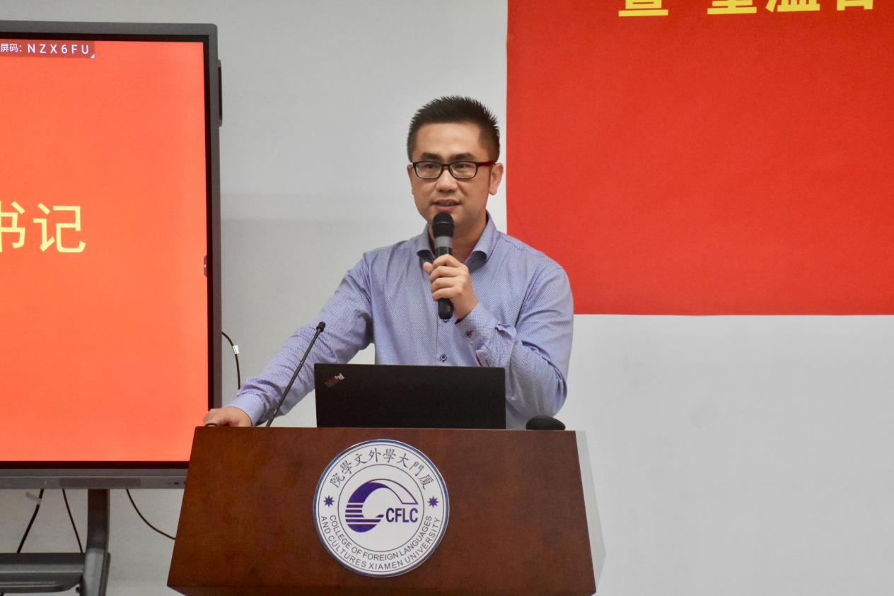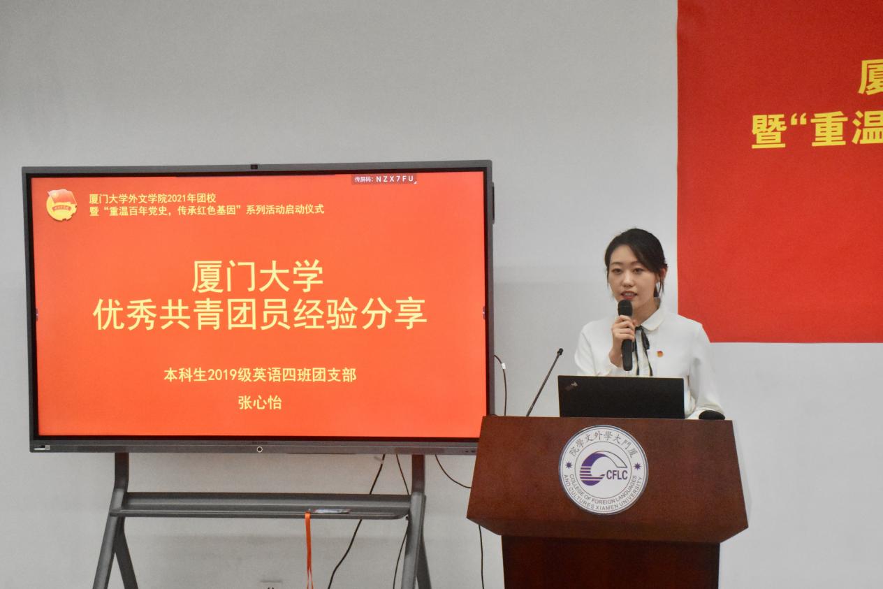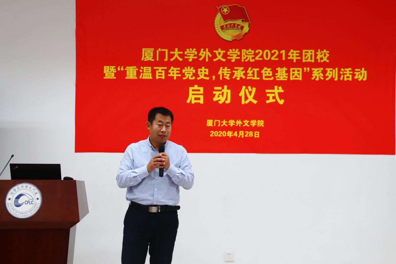 校团委副书记梁振伟首先致辞。他从党史学习教育的“色、香、味”出发,强调党史学习教育要突出讲政治本“色”。团员青年在党史学习教育过程中要沉下心、认真学,强化政治意识,培养学习兴趣,学出情感、学出认同、学出向往,更加坚定马克思主义信仰,自觉积极向党组织靠拢;要突出学党史的醇“香”。共青团作为党缔造和领导的青年政治组织,要把握青年学习的规律和特点,既要开展好知识性学习、学理化灌输,也要发挥实践育人优势,真正让团员青年参与进来、沉浸其中,做到有滋有味、有声有色地学党史;要突出促成长的甜“味”。共青团的根本任务是要培养社会主义建设者和接班人,要通过学习教育,进一步引导厦大学子肩负起弘扬、传承、践行嘉庚精神的使命和责任。最后,他预祝外文学院本次团校取得圆满成功,并对外文学子提出“立大志、入主流、登上大舞台,成就大事业”的殷切期望。