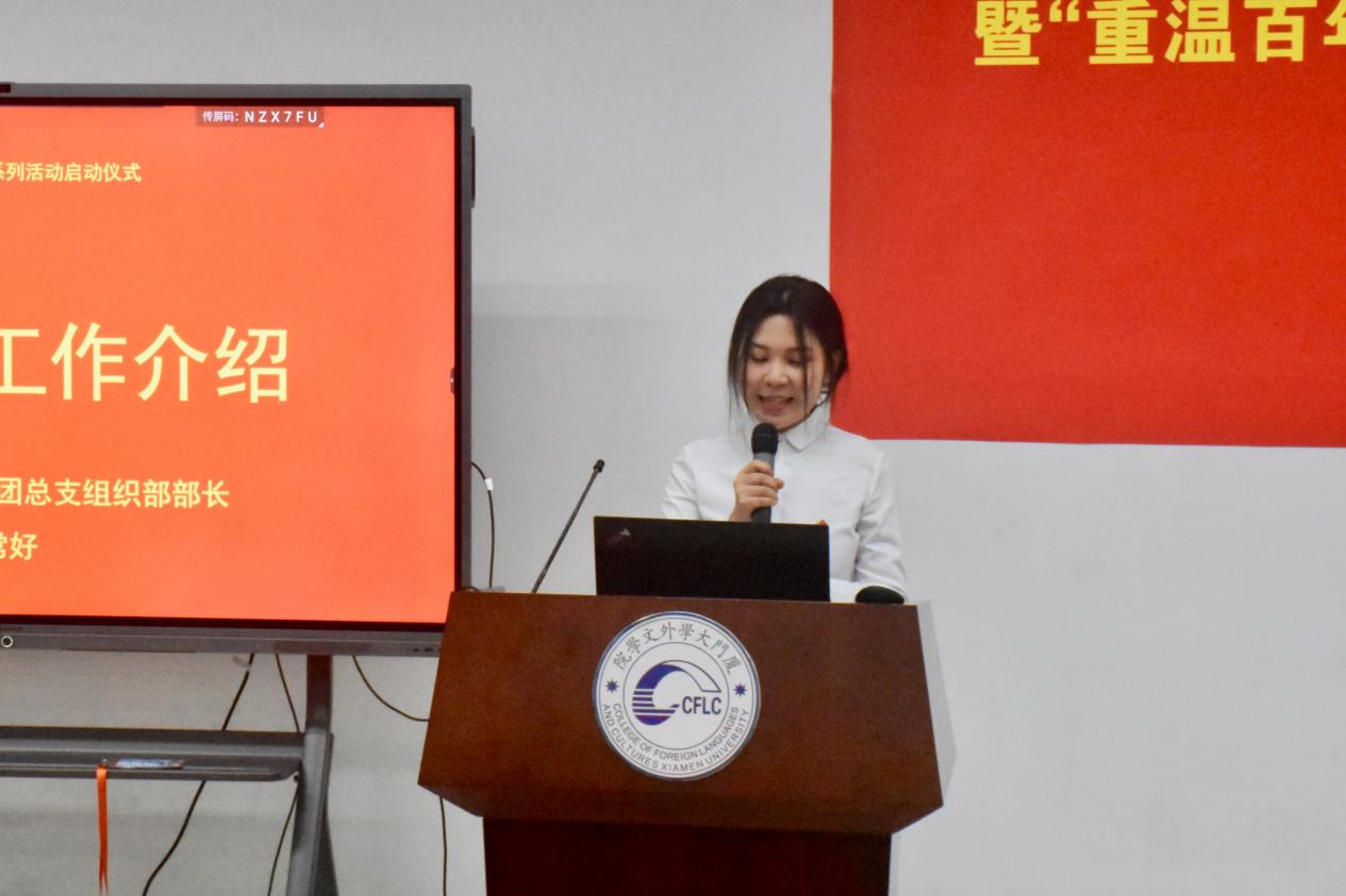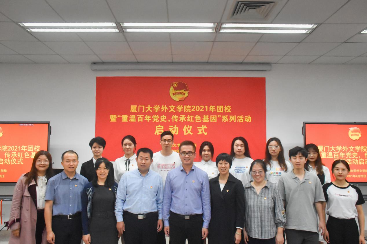 为迎接中国共产党成立一百周年,进一步引导团员青年学史明理、学史增信、学史崇德、学史力行,4月28日,厦门大学外文学院2021年团校暨“重温百年党史,传承红色基因”系列活动启动仪式在德贞楼112顺利举办。厦门大学团委副书记梁振伟,外文学院党委副书记马龙、沈丽秀,团委书记吴珊珊,团委副书记戴晓燕、蔡宇,辅导员杨盛澜,兼职团委副书记高凌雪莅临活动,本研团总支及各团支部委员参加了本次活动。活动由外文学院研究生团总支副书记蒋婕主持。