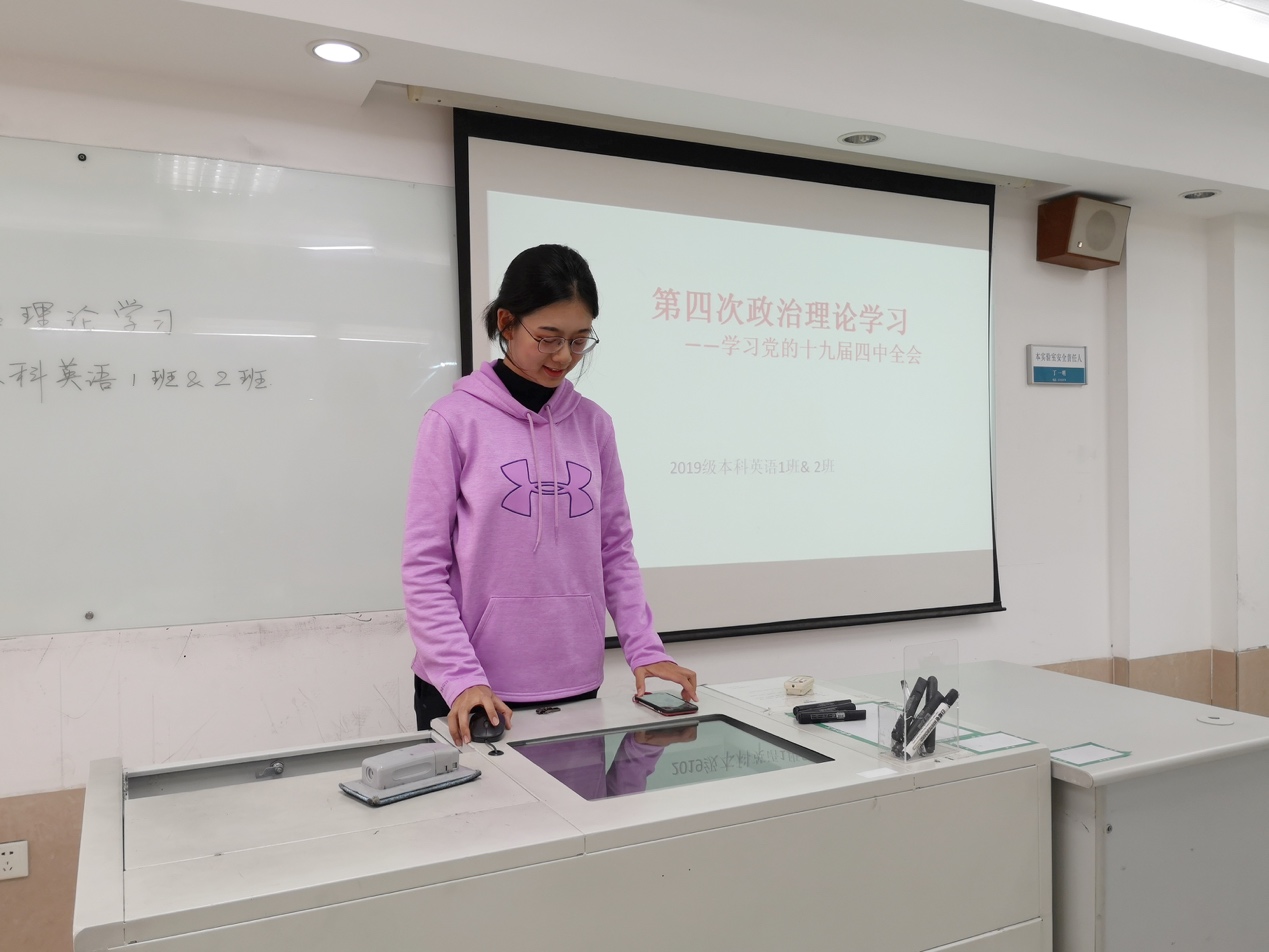 2016级本科法语班曾子玉同学颇有感触,发言道:“当今世界正经历百年未有之大变局,我国正处于实现中华民族伟大复兴关键时期。更加紧密地团结在以习近平同志为核心的党中央周围,深入学习贯彻党的十九届四中全会精神,在坚持和完善中国特色社会主义制度、推进国家治理体系和治理能力现代化上下更大功夫,使中国特色社会主义制度更加巩固、优越性充分展现,我们才能实现“两个一百年”奋斗目标、实现中华民族伟大复兴的中国梦!”