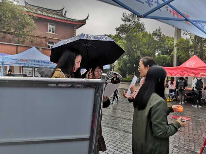 上午930分,参加路演活动的志愿者们便已将帐篷、桌椅、海报、照片等摆放就绪,做好了项目展示的前期准备工作。虽然当天下着小雨,但在学习雷锋同志“钉子精神”的鼓舞下,志愿者们依然以积极的态度、饱满的热情参与到活动中去,有序地组织着路演活动的进行。有志愿者手捧教案与照片,向同学们展示过往的志愿服务经历,讲解项目的具体内容;有的志愿者在南光餐厅和芙蓉湖畔附近发放传单,吸引同学前往了解项目信息,参与志愿活动。