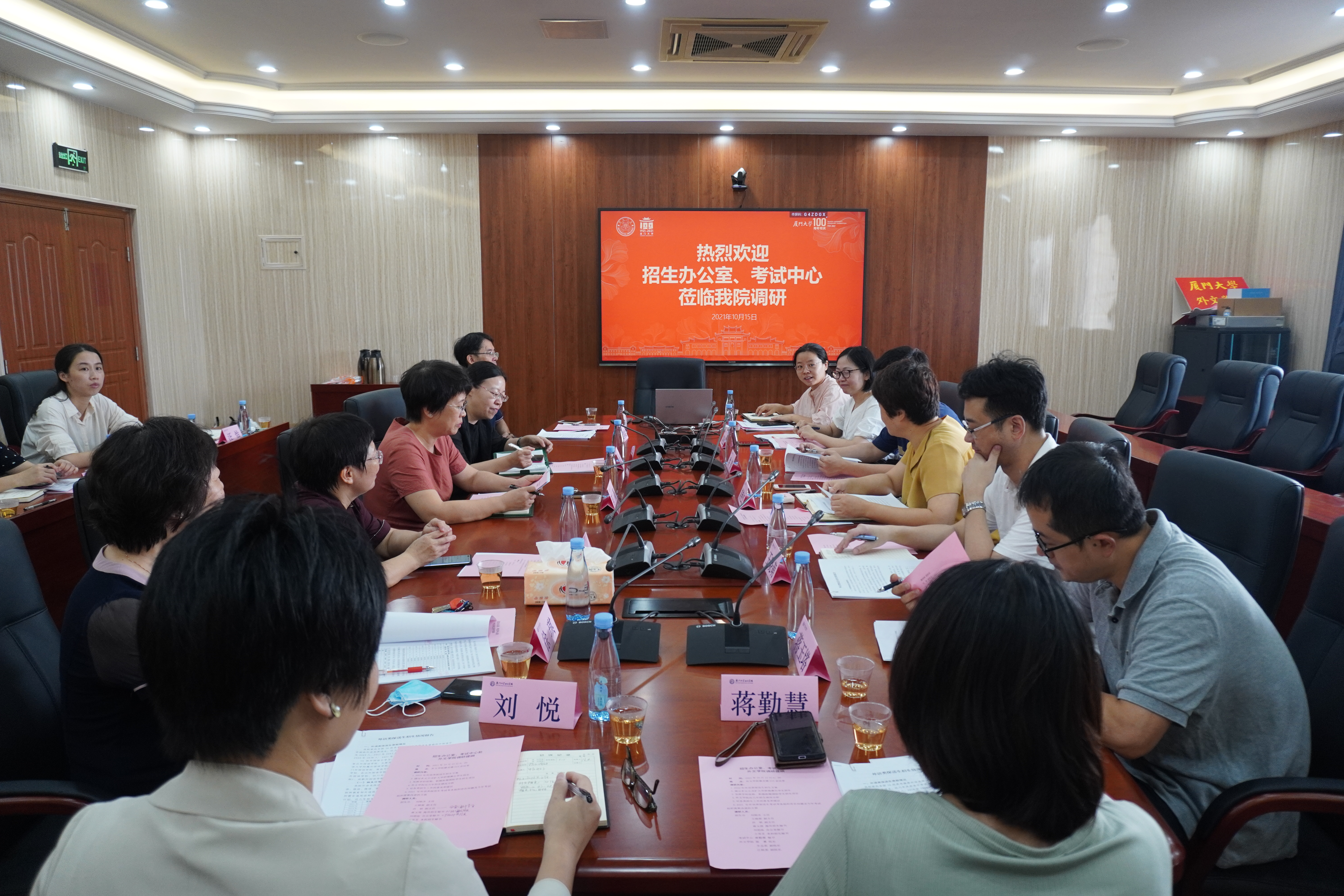 10月15日上午,厦门大学招生办公室和考试中心工作人员莅临外文学院调研,双方围绕外语学科招生情况在德贞楼515会议室展开热烈讨论。招生办公室主任刘艳杰,副主任王晓萌、洪镔,外文学院院长陈菁,副院长辛志英、江桂英、戴鸿斌、刘悦,原副院长徐琪出席本次会议。招生办公室秘书蒋玉塔、刘浥泓、王雪芝,考试中心秘书蒋勤慧,外文学院系部副主任、教学秘书、外事秘书共同参加。