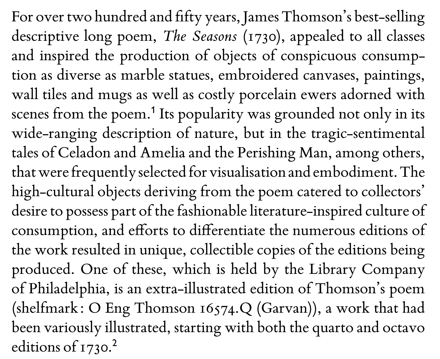 荣格教授继续为大家介绍另一种开篇的策略。第二篇范文的首段并没有提到学术传统,但它同样成功地将研究话题与更大的背景联系起来。主题句描述了汤姆生的长诗《四季》的受欢迎程度:它让各个阶层的读者爱不释手,诗歌所描绘的画面也成为各种工艺品上的图案。第二句解释受欢迎的原因,诗中充满感伤色彩的故事具有吸引力,启发人们在艺术品上再现这些故事。接着,第三句将“描绘《四季》故事的艺术品”具体定义为“高雅文化产品”(high-cultural objects),并指出它们迎合了收藏家参与文化消费的需求,因此产生了不少版本的《四季》的收藏品。在本段最后一句,终于引出本文的研究对象:其中一个特定的收藏版本增加了大量对原诗的解读,极具个人特色,值得深入考察和研究。