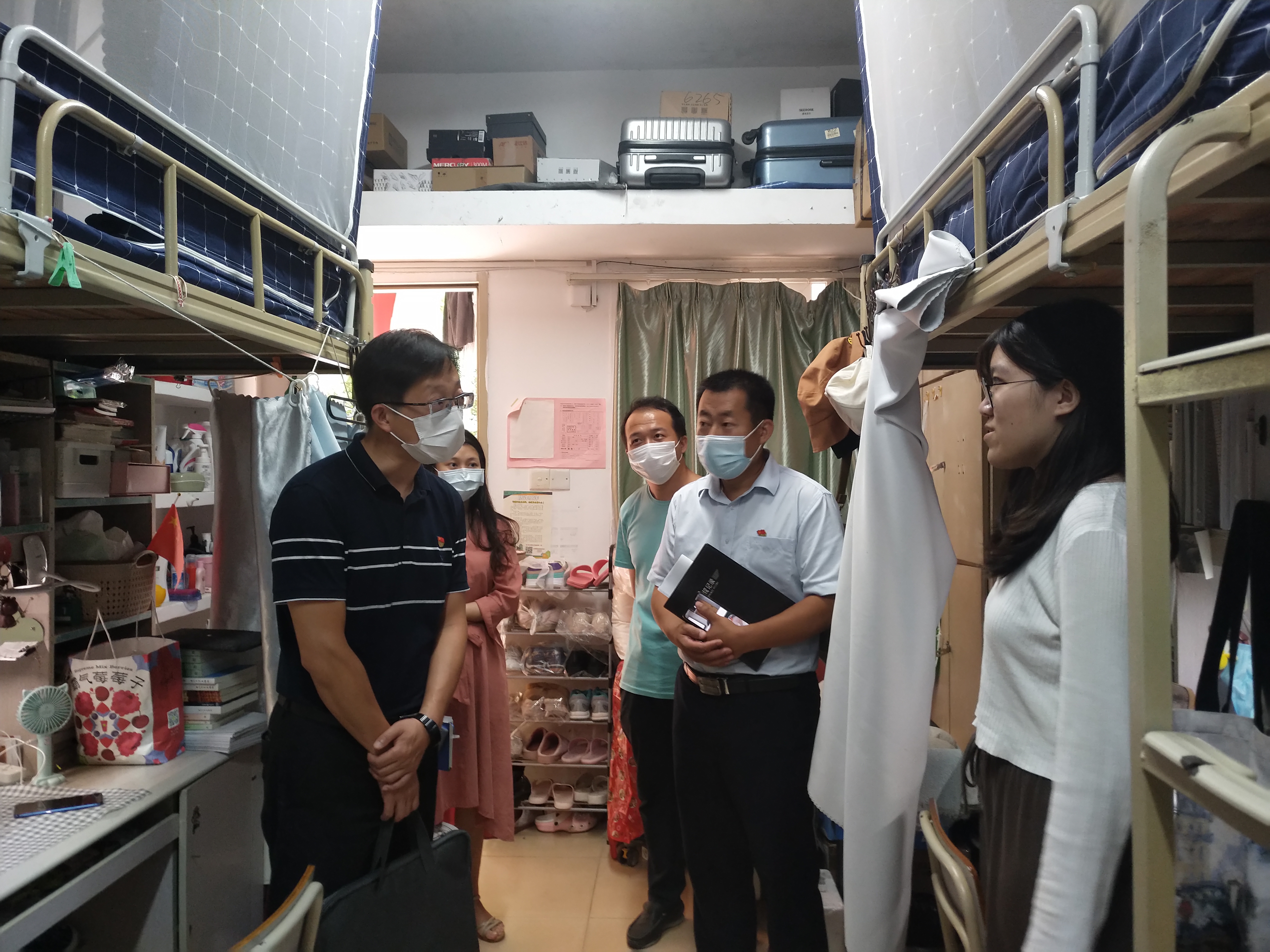 会议结束后,学生工作处副处长高斌一行和学院学生工作组实地走访了部分新生和老生宿舍。了解新生目前的选课及教材情况,线上课程所需网络及设备,疫情管理下学习和生活中的困难等。关注毕业生的就业情况,了解毕业生的需求,尽可能为学生创造良好的求职环境,减轻疫情带来的影响。
