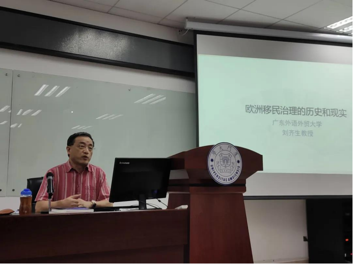2021年7月6日晚,广东外语外贸大学教授、博士生导师刘齐生老师在厦门大学南光三313教室为外文学院师生举办了题为 “欧洲移民治理的历史和现实”的精彩讲座。外文学院欧语系刘悦教授主持了讲座。外文学院师生积极参加了此次讲座。讲座现场座无虚席,主要参加对象为外语创新实验班全体同学,以及来自本院德语以及其他专业的师生。