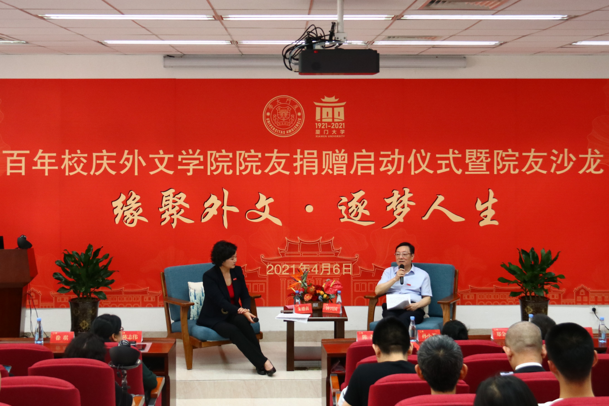 4月6日,厦门大学百年华诞如期而至。值此欢聚一堂、共襄盛举之时,外文学院在德贞楼112报告厅举办“缘聚外文·逐梦人生”百年校庆院友沙龙,特别邀请到了学院知名院友,中共厦门市委原副书记、厦门市政协原副主席、厦门仲裁委主任钟兴国先生以及德屹资本董事长、厦门大学兼职教授朱德贞女士回校,细数人生经历,分享人生智慧,畅谈人生感悟,为学弟学妹们答疑解惑,助力外文学子踏上逐梦征程。