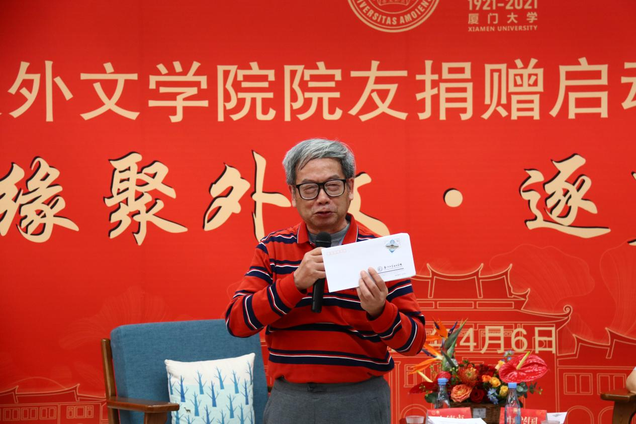 值此百年校庆的美好契机,五湖四海的院友再次缘聚外文。钟兴国、朱德贞的同学,同为77级院友的厦门大学郑启五教授为他们精心准备了一份意义非凡的礼物——贴着厦大百年校庆纪念邮票的外文学院信封,以此共同追忆昔日的厦园青春,出席沙龙的77级院友更是一同上台合影,留下了珍贵的记忆,在场的师生无不为之动容。沙龙最后,为感谢二位院友对学院多年以来的支持和关心,学院专门向他们送上了纪念品和鲜花。