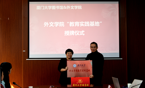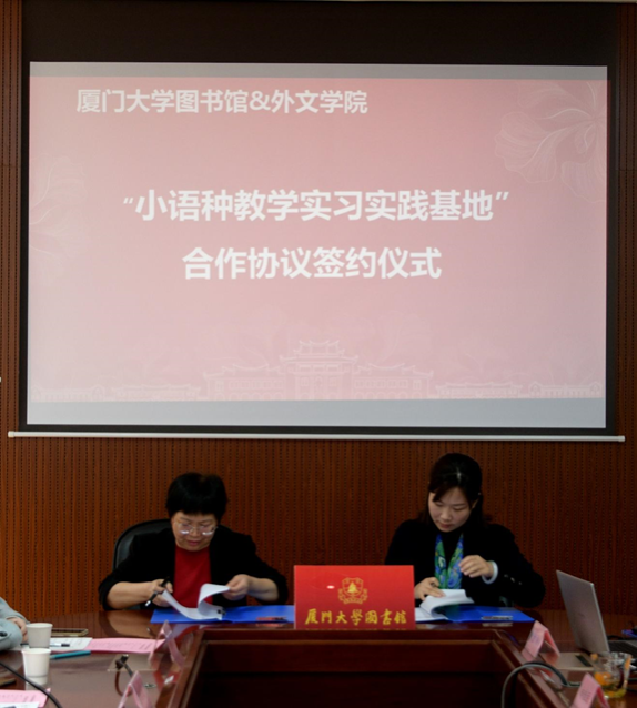 2023年2月23日上午,厦门大学外文学院与厦门大学图书馆顺利举行“小语种教学实习实践基地”合作协议签约仪式及授牌仪式。双方围绕资源服务需求、实习实践合作、人才培养等方面的合作可能性作了深入探讨。图书馆党委书记侯利标、副馆长陈娟及相关部门的工作人员,外文学院副院长江桂英、戴鸿斌及教师代表、学生代表等出席签约仪式。