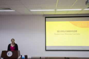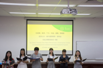 来自外文学院俄语专业一年级的学生向大家深情朗诵了俄国诗人普希金的名诗《我记得那美妙的一瞬》,并博得了现场的热烈掌声。来自俄语语言文学研究生一年级的吴丹凤发表了关于《世界青年文化交流》的主旨性演讲,她认为:“我们原本相隔万里,今日欢聚一堂,是缘分。各国青年应当相互理解与信任,相互扶持,了解彼此的文化,发现不谋而合之处,并建立起深厚的友谊。”接下来,来自外文学院俄语专业一年级的张妙如和武张灵同学为大家献上了俄语流行歌曲《Небо-Самолёты》,脍炙人口的流行歌曲也带动了现场外籍学生的轻声合唱。