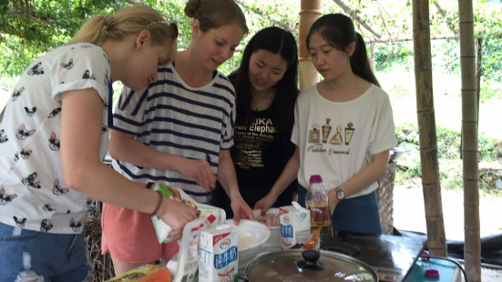 在厦门大学翔安校区的学生食堂用过午餐后,同学们乘车集体前往同安区的“房车公园”开始准备中俄特色美食。为了方便俄罗斯学生能顺利做出本国特色菜肴,中国学生事先采购齐全了俄罗斯学生所需要的牛肉、洋葱、甜菜头、酸奶油、炼乳等食材。这边的中国学生们开始洗菜、切肉、准备调料,那边的俄罗斯学生们也娴熟地开始烹饪本国美食,小伙子们用锋利的小刀处理着烤肉所需的牛肉,姑娘们驾轻就熟地煮起俄罗斯经典美食——红菜汤。