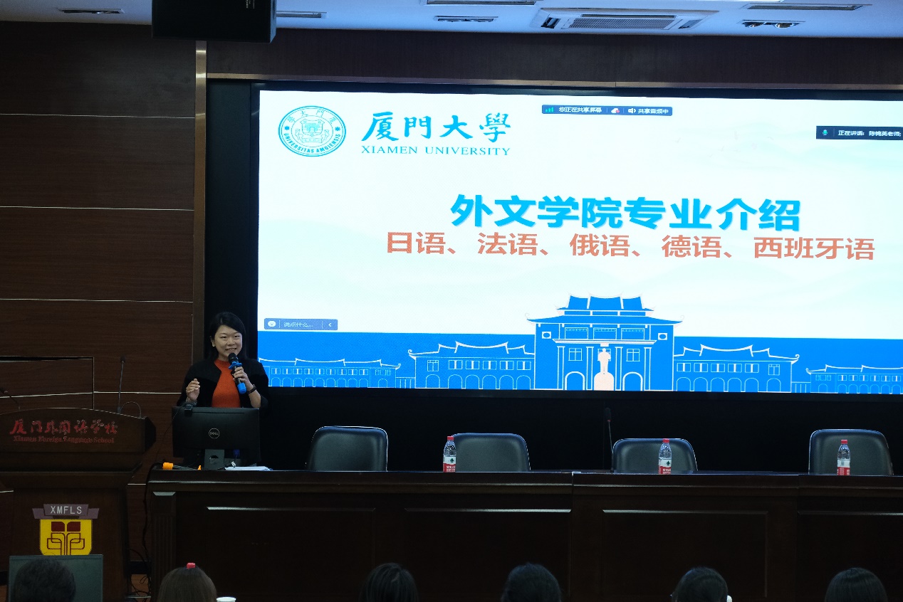 为更好地服务国家战略需求,进一步提升本科招生质量,扩大外文学院影响力,吸纳更多优质生源,11月27日下午,院长陈菁、副院长刘悦、欧洲语言文学系副主任张雅惠、2021级日语口译专业硕士生姚书勤等一行前往厦门外国语学校海沧校区高中部开展2024年本科生外语类保送生招生宣讲。厦门外国语学校副校长郑远鹏对陈菁院长一行的到访表示热烈欢迎。此次宣讲采用线上线下相结合的方式举行,学生在线下与老师们面对面沟通,家长主要以线上方式参与。