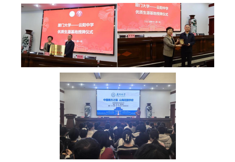 在重庆市云阳高级中学,徐琪教授向校党委书记李继君授予“厦门大学优质生源基地”牌匾。李继君书记对厦门大学长期以来对云阳中学的支持和帮助表示感谢。在“学涯规划与未来的大学生活”讲座上,蔡宇老师与该校学生深入互动,探讨了“什么是大学”“为什么上大学”“如何拥有幸福的未来”以及“专业和未来的关系”等问题,为学生生涯规划提供了宝贵建议。紧接着,蔡宇老师又带来了“中国南方之强,山海花园学府”讲座,通过列举鲁迅、陈景润等大师与厦门大学的故事讲述了厦大源远流长的学科底蕴,并展示了厦门大学的顶尖学科、一流的师资、优美的校园及丰富的实践,让在座的同学对厦门大学有了更深入的了解,同时也激发了他们对这所百年学府的向往。