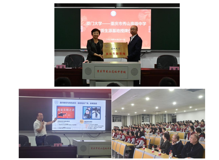2024年10月31日至11月1日,厦门大学外文学院党委书记徐琪教授、教学科长陈雯娜、团委副书记蔡宇一行三人赴重庆市秀山高级中学、重庆市云阳高级中学校开展“厦门大学优质生源基地”授牌、学术讲座、招生宣讲等系列活动。