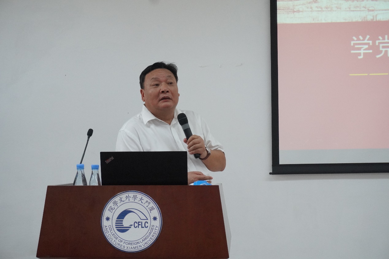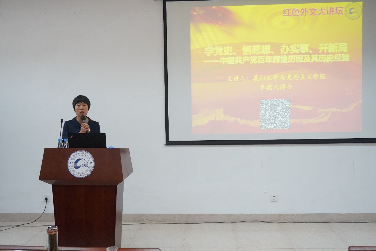 5月19日下午,外文学院在德贞楼112报告厅举行第二十期“红色外文大讲坛”。本次讲座邀请了厦门大学马克思主义学院李德元老师作题为《学党史,悟思想,办实事,开新局——中国共产党百年辉煌历程及其历史经验》的报告,学院全体教职工参加讲座,讲座由外文学院党委副书记沈丽秀主持。