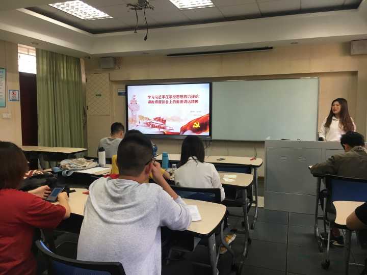 本次活动第一部分,由狄旭劲和施伟帆同学带领支部党员学习习近平总书记在学校思想政治理论课教师座谈会上的重要讲话精神。