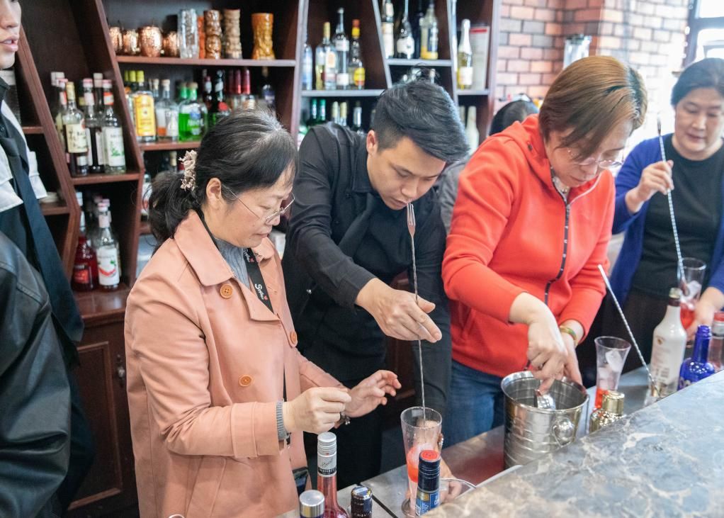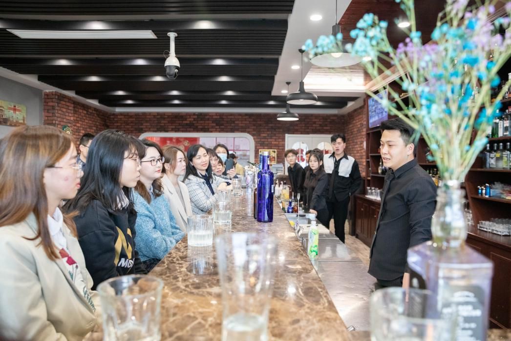 花式调酒也备受师生欢迎。调酒教室里气氛热烈,师生们围在调酒师身边,欣赏专业老师如同变魔术一般舞动双手,让冰冷的酒瓶在空中跳起了灵活的舞蹈。精彩的手法让师生们看得如痴如醉,不时爆发出一阵阵喝彩声。老师表演完毕,大家便迫不及待地动手一试,把不同颜色的酒依次注入晶莹剔透的玻璃杯中,一杯杯色彩绚丽、层次分明的鸡尾酒便呈现出来。大家谈笑风生,杯盏交错,细心品味,畅快交流,无比享受这个特殊日子里的浪漫午后。