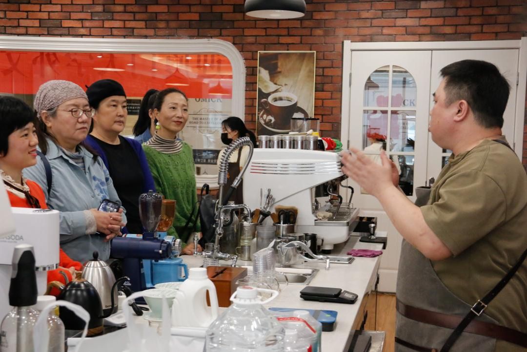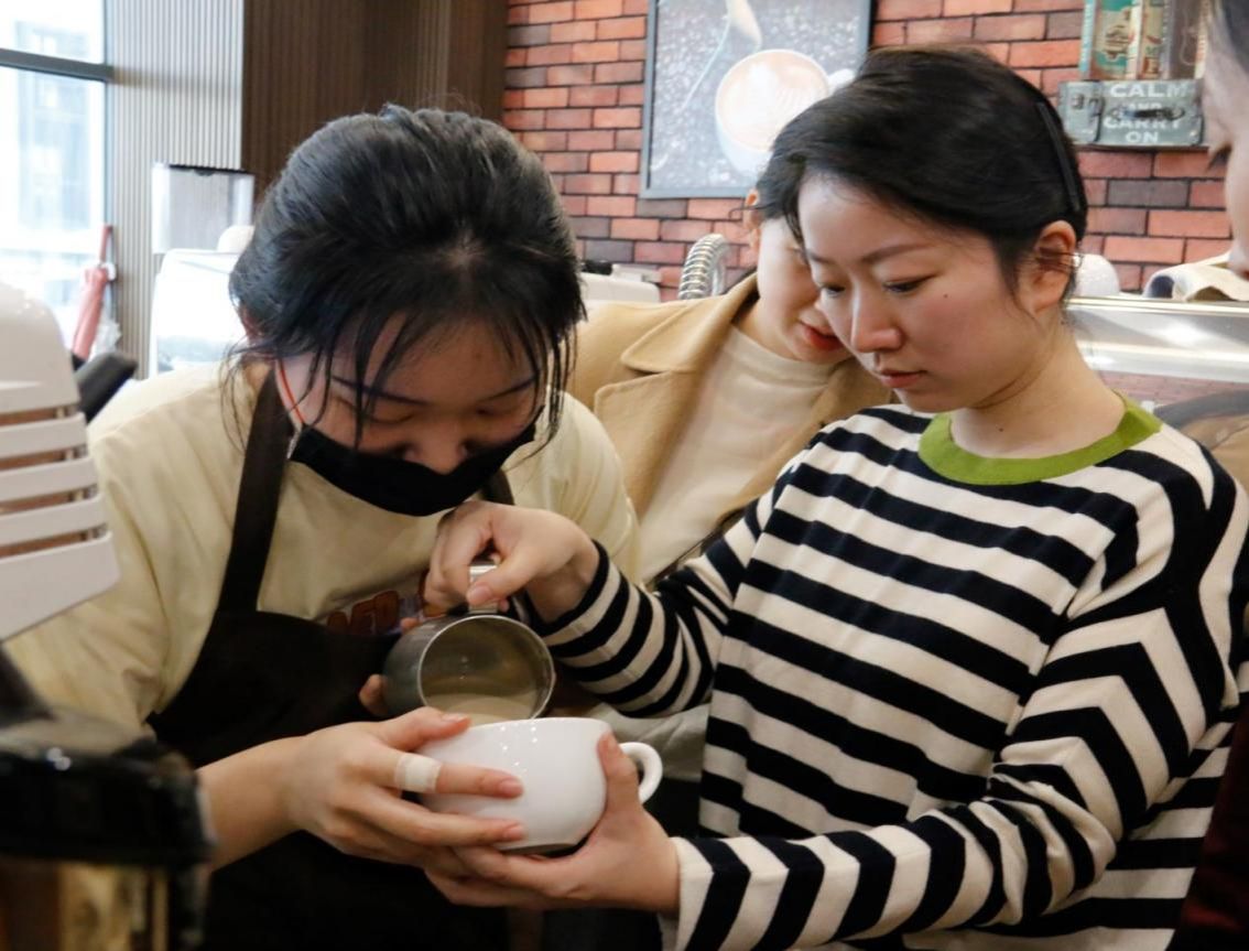 咖啡拉花对技巧要求更高。师生们不仅享受了一场干货满满的咖啡文化课,了解到咖啡的诞生、物理化学特性、地理分布、种类划分,更是在培训老师的指导下,亲手打磨咖啡豆、萃取咖啡、打发奶泡,勾勒出一朵朵别有趣味的花纹。指导老师为大家讲解咖啡的制作过程,他告诉大家,“我希望你们是真的热爱,把它当成一门艺术,而不是谋生手段”,引起了现场不少老师的共鸣。一朵朵精致的拉花浮现在杯中,香气氤氲,“女神”们手捧着自己精心制作的咖啡,尽情享受着午后悠闲的美好时光。