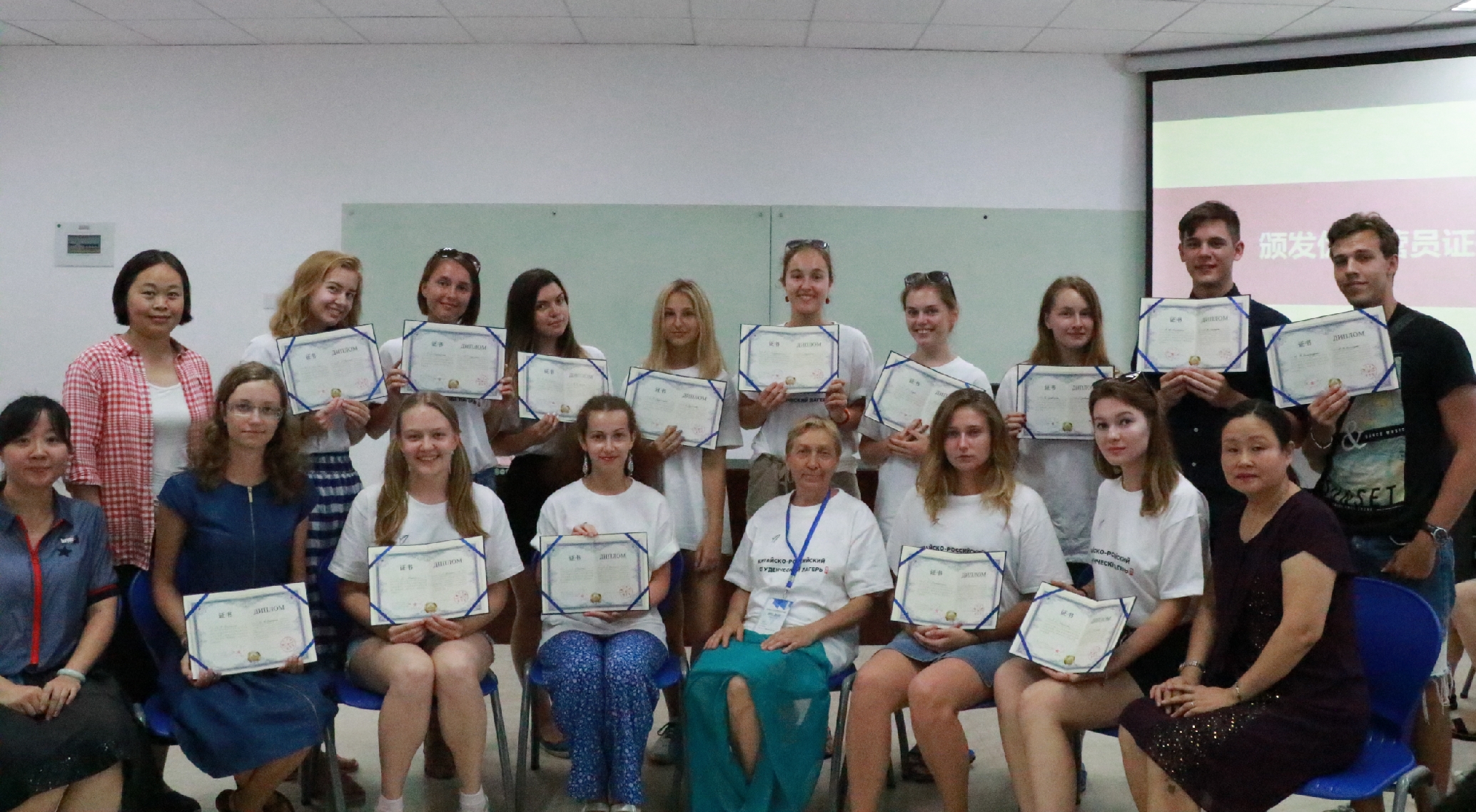 中方学生狄旭劲和俄方学生Полина担任本次闭幕式主持人。首先是迟镏玲同学和Полина同学分别作为中俄学生代表讲话。接着顾鸿飞教授为15位莫大学生颁发优秀营员证书并合影留念。随后中俄同学们都带来了精彩的节目表演。