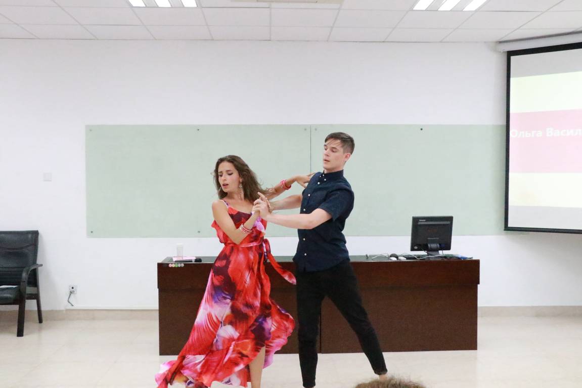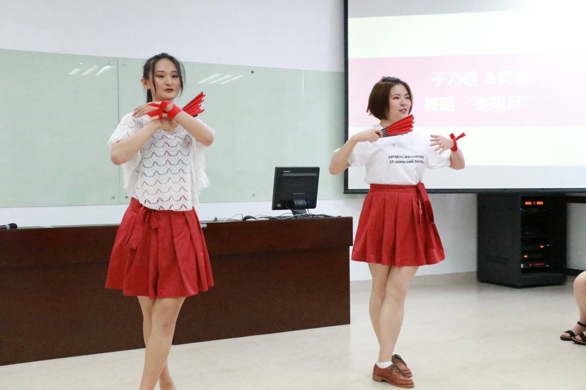 莫大学生Мария Высочкина为大家声情并茂地朗诵莱蒙托夫的诗歌《诗人之死》。接着杨茜茜、秦肇轩演唱的歌曲《Super star》点燃全场氛围。随后Ольга Васильева给大家带来的东方舞蹈表演和于乃晗、周唯表演的舞蹈《寄明月》更是博得满堂喝彩,将气氛推向了高潮!本科一年级学生为大家合唱歌曲《北京东路的日子》,以表达大家对交流营美好时光的怀念。Ольга Васильева再度登场,与Александр Малышкин 给大家带来美丽的华尔兹舞蹈。最后压轴出场的是中俄学生合作的小品《装病》引得哄堂大笑,掌声不断,大家都被精湛的演技折服。