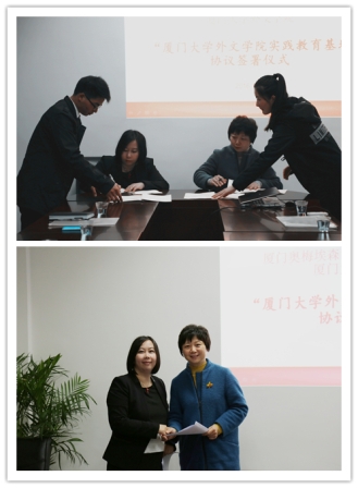 2016年3月17日下午,我院与厦门奥梅埃森设计文化传播有限公司签署“厦门大学外文学院实践教育基地”协议仪式在南光三524会议室举行。厦门奥梅埃森设计文化传播有限公司施洁予总经理、姚远副总经理、陈昊洋副总经理等一行与我院徐琪副院长、法语系主任胡老师、欧语系副主任方老师等师生代表共同出席。