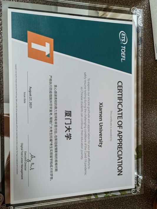厦门大学外文学院国外考试中心是中国教育部考试中心于1985年在我校设立的综合性国外考试机构。多年来承办了如雅思、托福、GRE、GMAT、WSK、BEC等海外考试项目,近40年来为我校师生提供了极大的便利及优质的考试服务。中心拥有一支掌握了精湛技术及具有高度专业服务意识的考务团队,在历年考评中屡屡获奖,曾获“雅思全国优秀考点”“托福全国优秀考点”“全国最受欢迎雅思考点”“雅思特特别献奖”等。