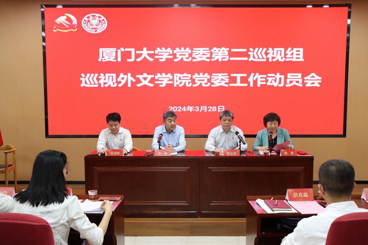 3月28日,校党委第二巡视组在南光三112报告厅召开巡视外文学院党委工作动员会。校党委副书记、纪委书记、国家监委驻厦门大学监察专员全海,第二巡视组组长邱七星、副组长张清榕,巡视办主任洪真裁,第二巡视组其他成员出席动员会。外文学院党政领导班子成员、退休干部代表以及全体教职员工参加会议。会议由院党委书记徐琪主持。